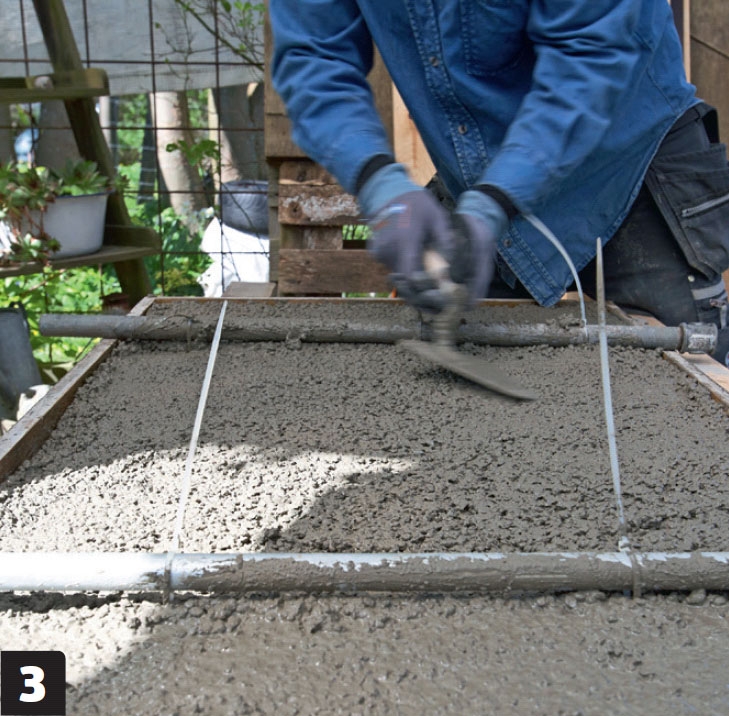 Täytä muotti nurkkia myöten. Kaada muottiin lisää betonia ja tasoita pinta, jotta betoni valuu muotin reunoille asti.