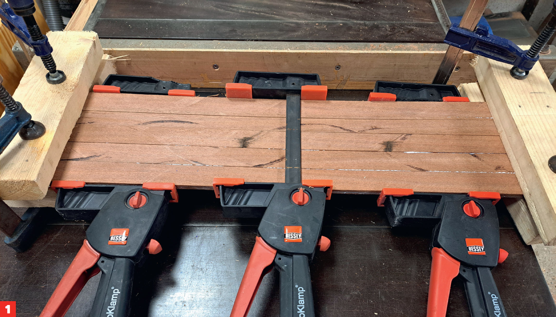 Tee aluksi levyt, joista palaset sahataan. Levyt tehdään listoista, jotka on sahattu vanhoista mahonki-ikkunoista. Puu on niin laadukasta, ja se kestää vielä pitkään. Listat liimataan yhteen puuliimalla 7 milliä paksuksi levyksi.