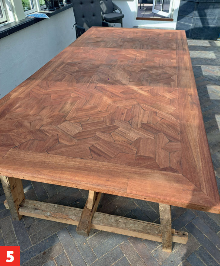 Pöytälevyn koko on 136x394 senttiä, joten se yltää rungon reunojen yli. Pöytälevy koostuu vanerilevystä ja sen päälle liimatuista mahonkipalasista. Palaset ovat sen muotoisia, että ne sopivat yhteen siitä huolimatta, miten päin ne asennetaan. Liimaaminen on helppoa, kun palaset voi asentaa sattumanvaraisesti.