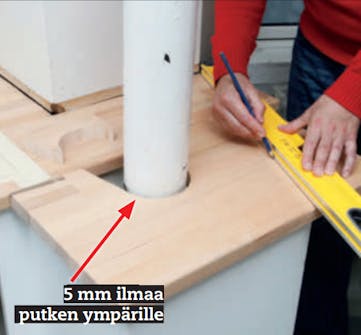 Tarkista, että viemäröinnin ja putkien ympärillä on vähintään 5 mm ilmaa. Tähän merkitään viisto saumauslinja seuraavaa levyä varten.