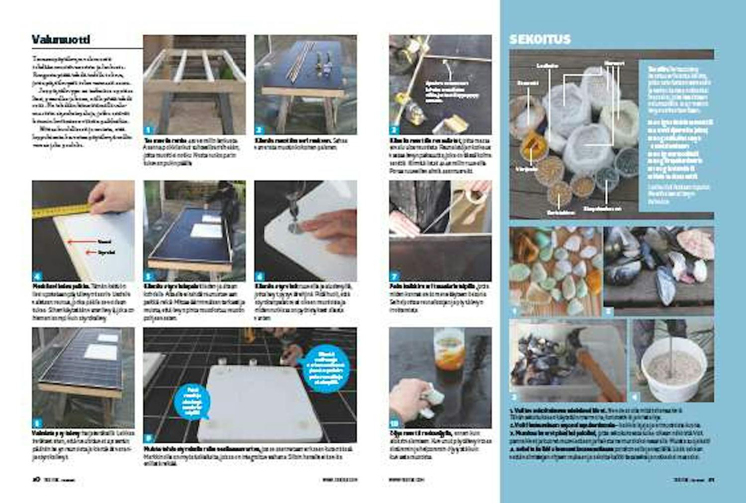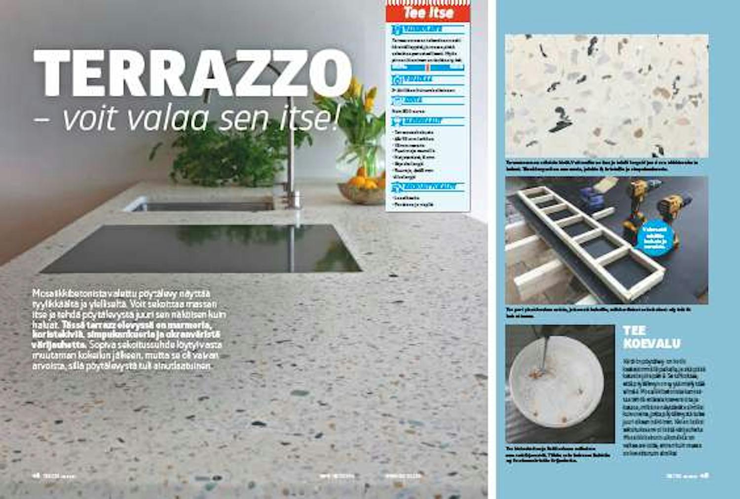 Tee näin: Terrazzolevy koostuu erilaisista kivistä, jotka sekoitetaan sementin ja veden kanssa notkeaksi massaksi, joka kaadetaan valumuottiin. 1x2,7 metrin levyä varten tarvitaan: