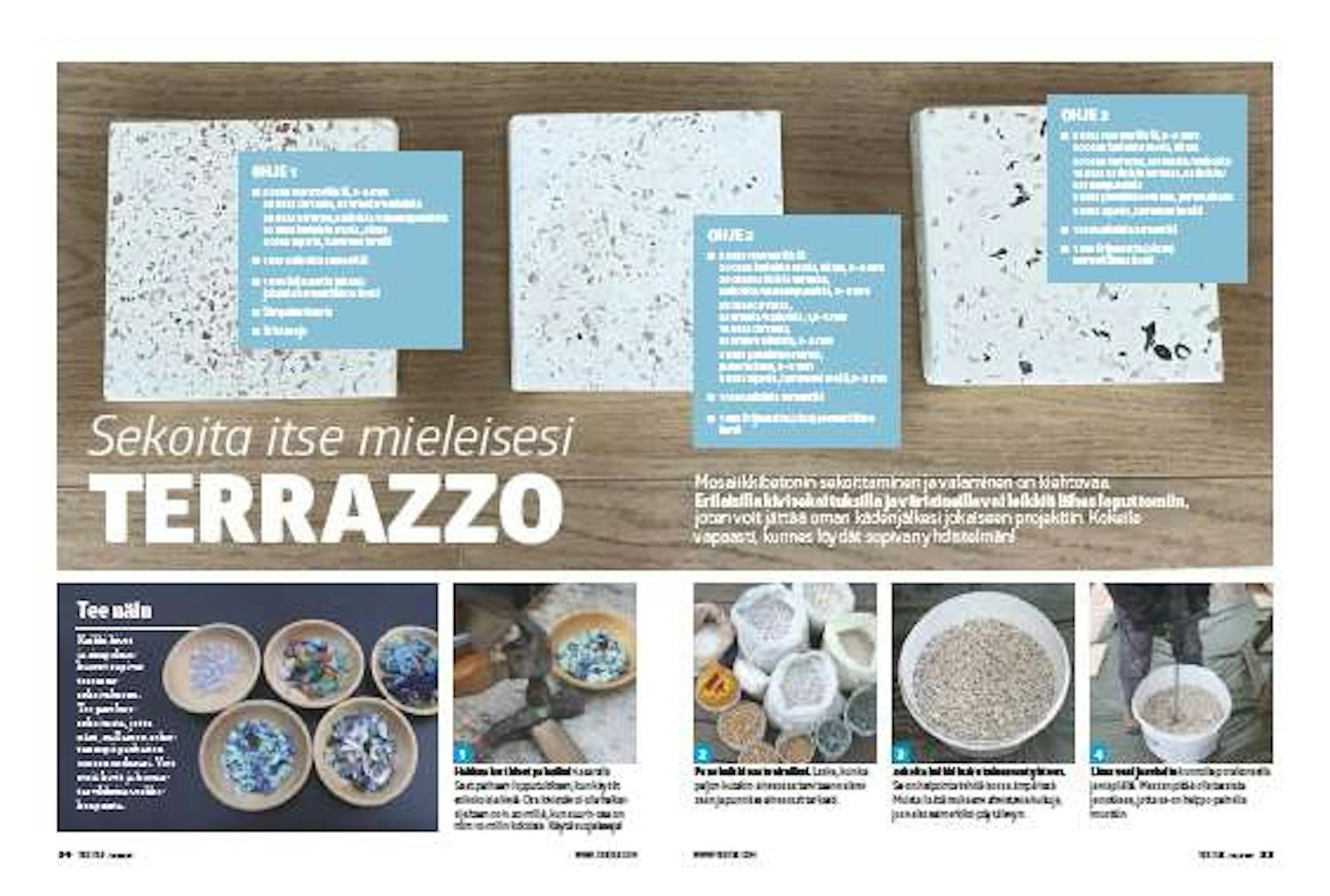 Terrazzomassan tekeminen vaatii kärsivällisyyttä, ja massa pitää sekoittaa perusteellisesti. Myös pinnan hiominen on tarkkaa työtä.