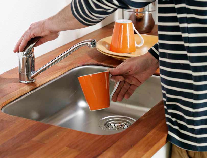 Kohta allas liimataan jyrsittyyn huullok-seen, mutta tätä ennen teemme koe-sovituksen, jotta voimme suojata pintoja hyvin maalarinteipillä. Aiomme käyttää mustaa Tec7-liimaa, joka kiinnittyy kaikkiin materiaaleihin. Tämä liima-massa on sekä joustavaa että vesitiivis-tä. On vain muistettava varmistaa, että liima tarttuu koko huulloksen pintaan, jotta pöytälevyn ja altaan reunan väliin ei pääse vettä.