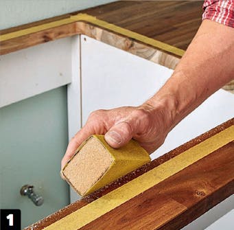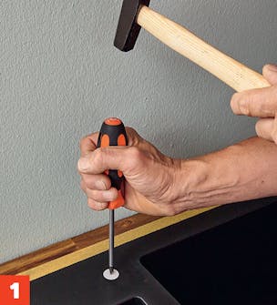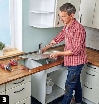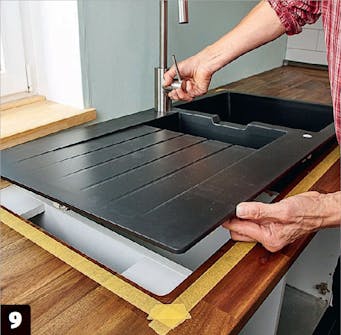 Maalarinteipistä on paljon apua. Voit merkitä sillä pöytälevyyn ala kaapin seinien paikat ja piirtää siihen altaan reunaviivan.