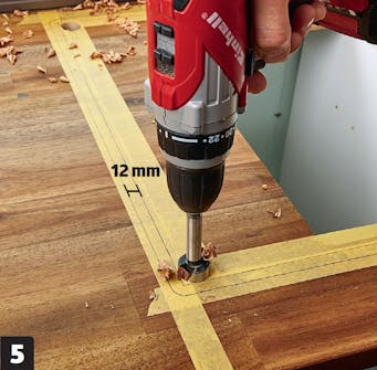 Aseta allas pöytälevyssä olevaan reikään. Silikonin pitäisi olla suunnilleen keskellä 12 millin levyistä puureunusta.
