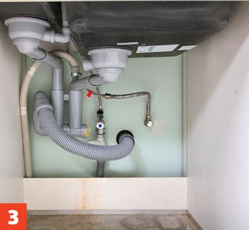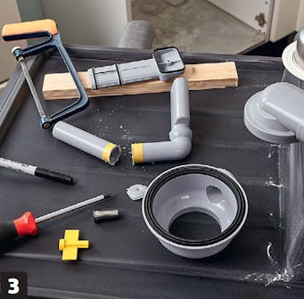 Kokoa vesilukko ja allaskaappiin tulevat putket. Voit joutua lyhentämään viemäriä, jotta se sopii paikalleen. Onneksi putki on helppo lyhentää siististi rautasahalla.