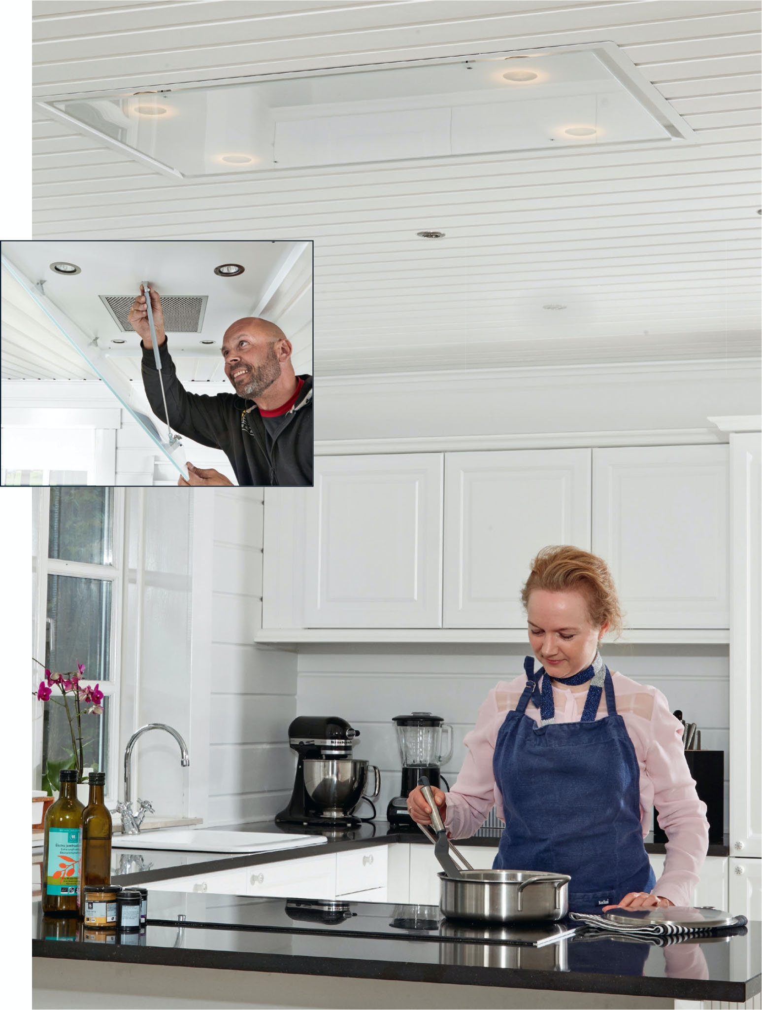 Uudenlainen liesituuletin on yllättävän helppo asentaa kattoon. Laite kuitenkin painaa, joten tarvitset apua, kun olet sahannut kattoon aukon.