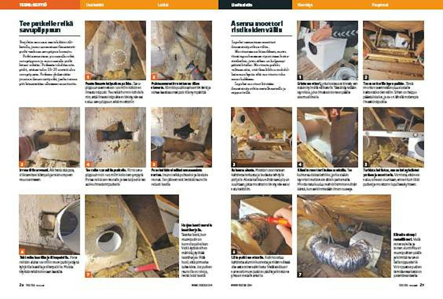 Putki asennetaan poraamalla reikä savupiippuun ja muuraamalla putki kiinni reikään. Putkesta tehdään niin pitkä, että se tulee 15-20 senttiä ulos savupiipusta. Putkeen yhdistetään joustava ilmastointiputki, jonka toinen pää kiinnitetään ulkoiseen moottoriin.