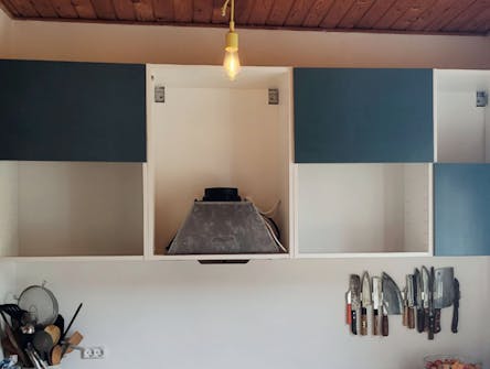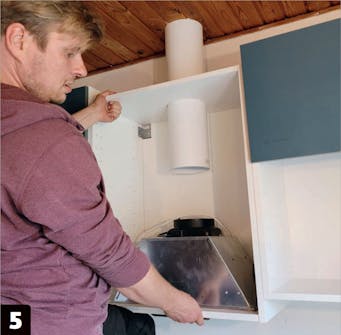 Kun reiät on tehty, välipohjan läpi työnnetään putki, minkä jälkeen asennetaan kaappi ja liesituuletin.