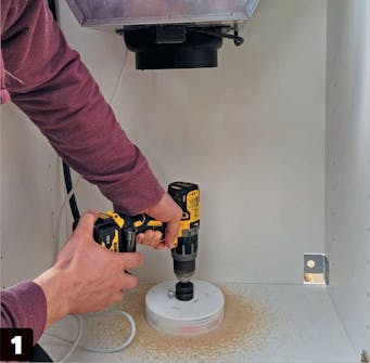 Tee reikä 125 millin ilmastointiputkelle. Käännä kaappi ja liesituuletin ylösalaisin ja mittaa reiän paikka esimerkiksi luotilangan avulla. Poraa kaappiin 125 millin reikä.