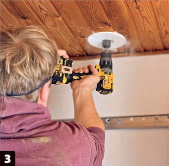 Poraa reikä välikattoon. Aloita alhaalta ja poraa kattoon reikä 125 millin reikäsahalla. Tyhjennä terä kipsilevyjen jälkeen ja poraa lautojen läpi.