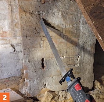 Poista saumat irrotettavan tiilen vierestä. Kiinnitä puukkosahaan kiviterä ja sahaa laastisaumat pois tiilen ympäriltä.