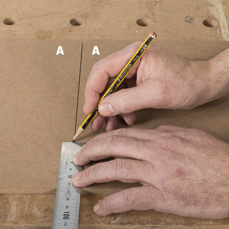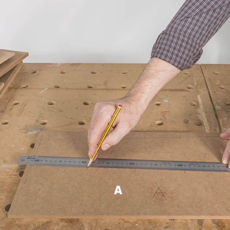 Piirrä välilevyjen (B) molempiin sivuihin kaltevien hyllyjen paikat. Koska välilevyt sijoitetaan pohjalevyn päälle, mitat ja viivat on tehtävä 10 mm lähemmäksi pohjalevyn reunaa kuin äsken tekemäsi sivumerkinnät.