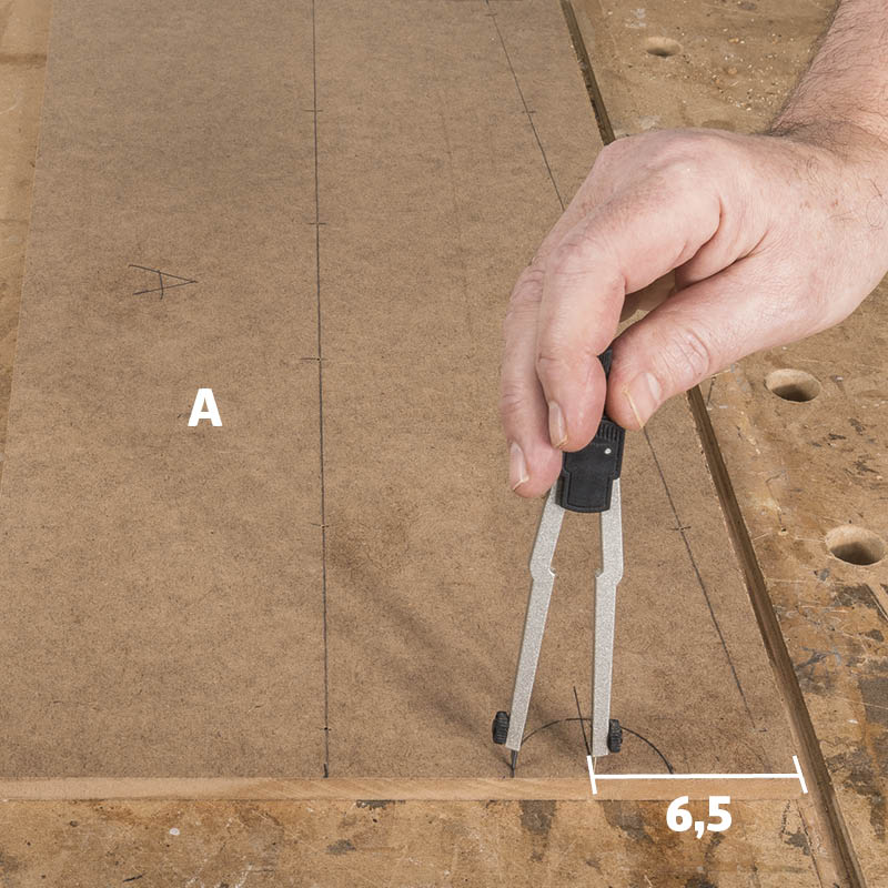 Tee sivuihin (A) ja välilevyyn (B) merkinnät koloille, joista sormet voi työntää sisään purkkeja poimittaessa. Piirrä etureunaan puoliympyrä, jonka halkaisija on 5 cm. Sivuilla ympyrän keskikohta on 6,5 cm alareunasta, välilevyssä 5,5 cm alalevystä.