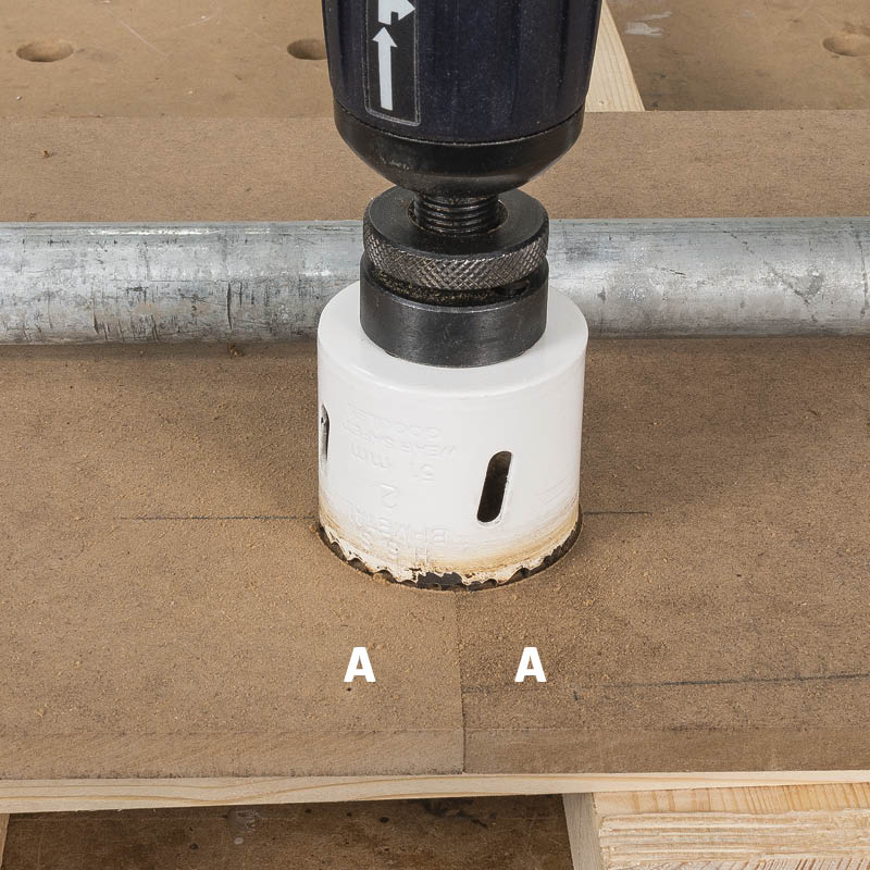 Idea on yksinkertainen: levynreuna, johon kolo tehdään, tuetaan vastaavaan levynreunaan niin, että keskiöpiikin voi ohjata levyjen väliin ja reikäsahalla voi sahata täysin suoraan. Voit lyödä kaksi kärpästä yhdellä iskulla: sivut ja välilevyt tuetaan pareittain yhteen, jolloin reiän molemmat puolikkaat tulevat käyttöön.