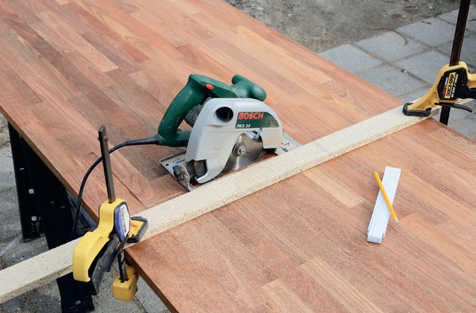 Sahaa ensin kaksi levykappaletta (C ja D) piirroksen mittoihin. Kappaleet sahataan pyörösahalla ohjainkiskon mukaan. Esimerkissä käytetään apuna listaa.