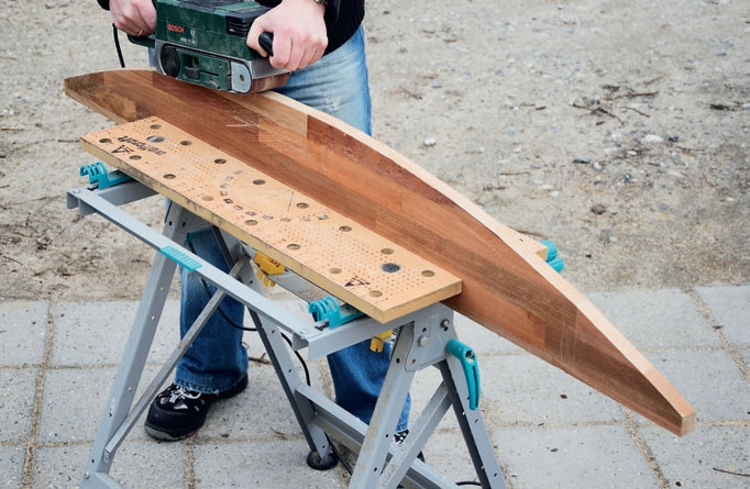 Pienen kappaleen etureuna pyöriste-tään. Kaareva linja tehdään Ø 170 cm:n ympyrän mukaan. Levyn sivut ovat 3 cm leveitä ja keskikohta 20 cm (kts. kuva). Kaareva linja sahataan pistosahalla ja reuna siistitään nauhahiomakoneella.