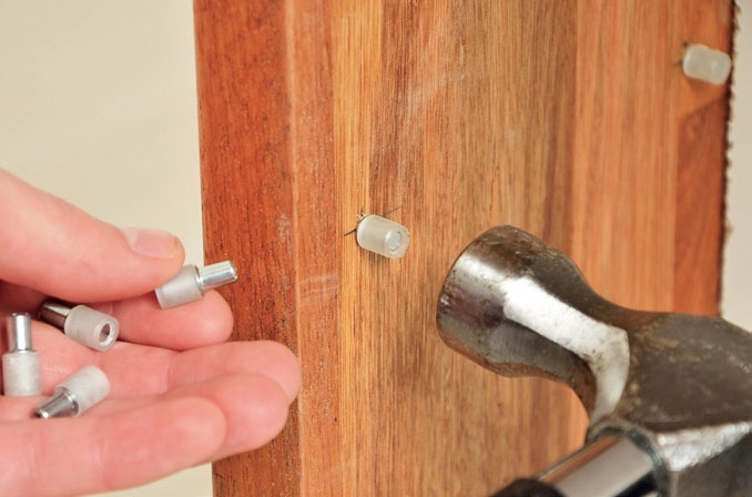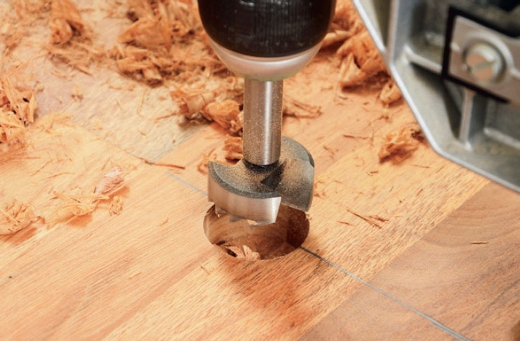 Poraa heloille reiät 35 mm jyrsinporalla. Käytä poratelinettä, jottet vahingossa poraa liian syvälle levyyn. Reiän pitää olla niin syvä, että koko hela saadaan upotetuksi levyyn.