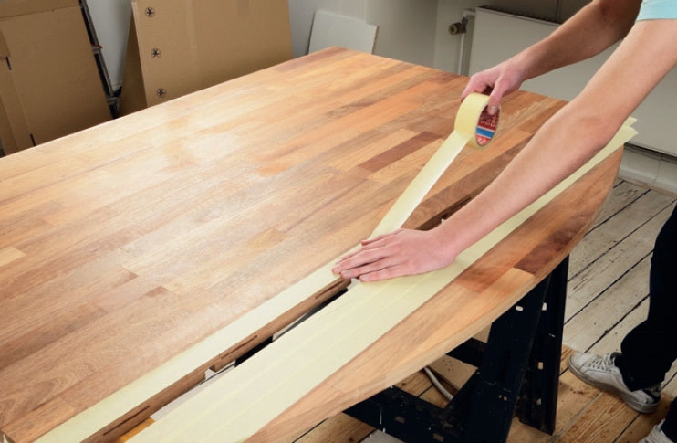 Ennen kuin levyt kootaan, levyn pinta suojataan maalarinteipillä. Se estää liimaa tunkeutumasta levyn näkyvälle pinnalle.