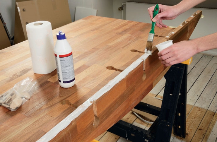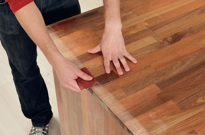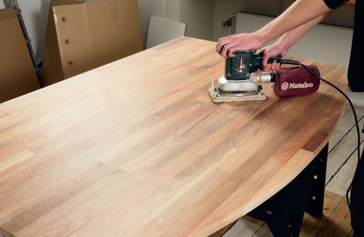 Aseta pöytälevy alapuoli ylöspäin ja hio ne kohdat, joista pöytälevy ja sivukappaleet liimataan yhteen. Näin liima kiinnittyy paremmin.