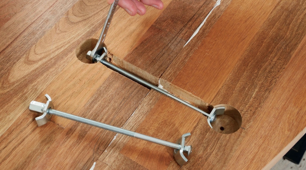 Kaksi pöytälevyä yhdistetään toisiinsa lamelleilla, heloilla ja liimalla. Näin liitos pitää varmasti.