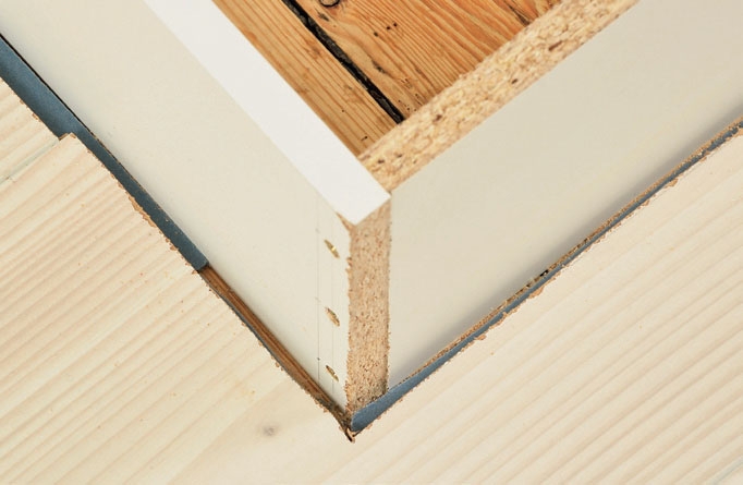 Sokkeli rakennetaan melamiini-levystä. Osat yhdistetään 4 x 40 mm ruuveilla ja kiinnitetään lattiaan pienillä kulmaraudoilla. Varmista, että sokkeli tulee vaateriin, jotta seuraavat työt sujuvat hyvin.