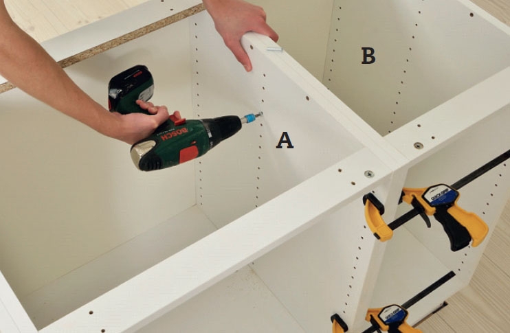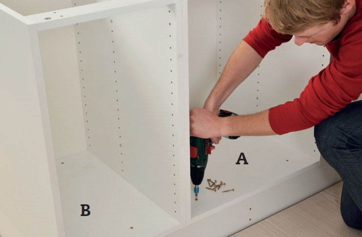 Aseta kolme kaappia (A ja B) paikalleen sokkelin päälle ja ruuvaa ne yhteen. Jos kaappien mukana tuli kokoamisruuvit, käytä niitä tai kytke kaapit yhteen 4 x 35 mm ruuveilla.