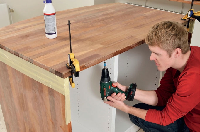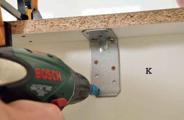 Nyt pöytälevy voidaan liimata kahteen sivukappaleeseen. Kiinnitä levy myös keittiökaappeihin 4 x 40 mm ruuveilla. Ruuvaa ruuvit alapuolelta.