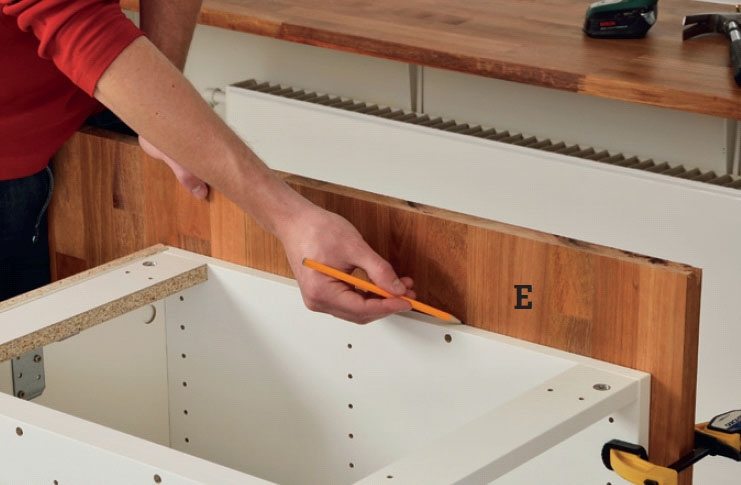 Merkitse, miten sivut (E) sahataan Ne ulottuvat 2-3 mm kaappien yläreu-nan yli. Sahaa sivut. Hio reunat ja käsittele takapinta keittiötasoon sopivalla öljyllä.