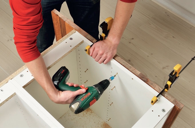 Kiinnitä pöytälevy puristimilla ja ruuvaa levy kiinni kaapin ylimpien listojen läpi. Käytä 4 x 40 mm ruuveja.
