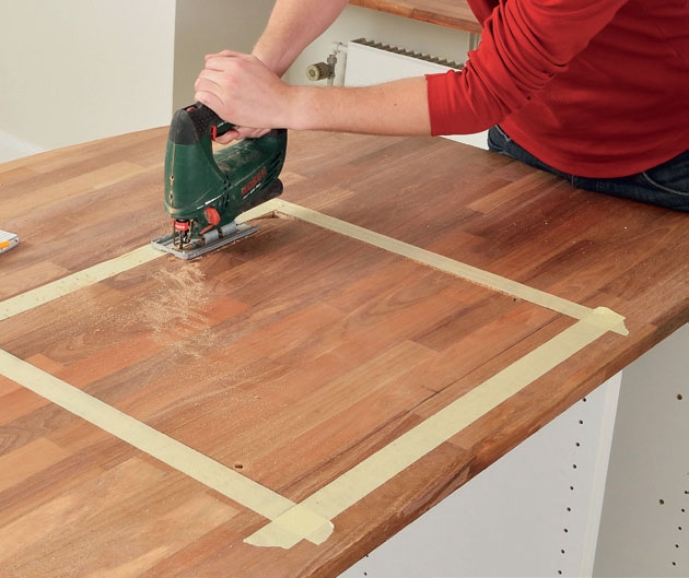 Kun ostat uuden liesitason, saat usein myös mallineen, jonka avulla voit tehdä pöytälevyn merkinnät. Tummaan pöy-tälevyyn kannattaa käyttää maalarin-teippiä sahauslinjojen merkitsemiseen. Se nimittäin näkyy paljon selkeämmin kuin lyijykynäviiva. Poraa ensin reikä yhteen merkkialueen kulmaan. Sahaa sitten siitä alkaen aukko liesitasolle. Sähköasentaja yhdistää sähköliittymän.