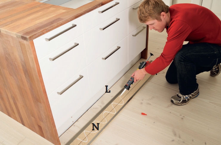 Esimerkkikohteeseen oli tehty kelluva lattia ennen kuin saareke rakennettiin. Sähköasentaja asensi samalla saarekkeen alle liitäntärasian liesita-soa varten. Lattiapäällysteen ja sokke-lin väliin pitää jäädä vähintään 10 mm rakoa. Rako katetaan myöhemmin.