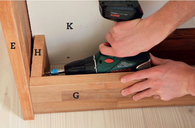 Taustaverhoiluun (K) kiinnitetään kaksi tukipalaa (J). Niiden tehtävänä on tukea alinta hyllyä. Kiinnitä nyatoh-levystä sahatut tukipalat 4 x 40 mm ruuveilla.