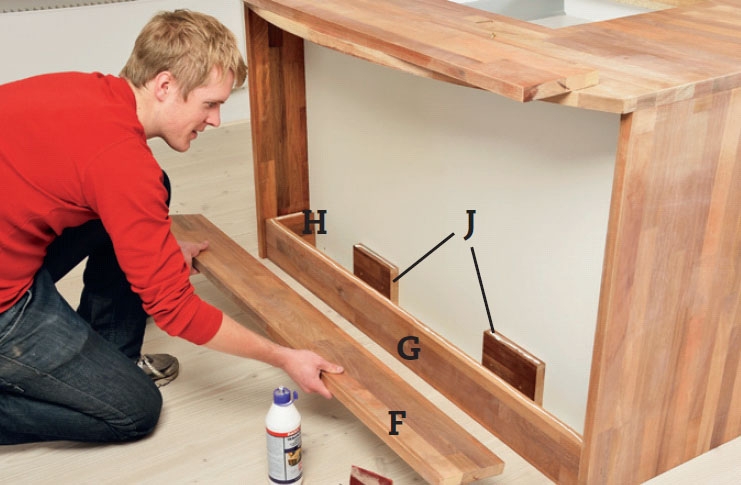 Sivele sokkelin reunaan (G), päätykappaleisiin (H) ja kahden tukipalan (J) reunaan liimaa. Asenna alin hylly (F) paikalleen.