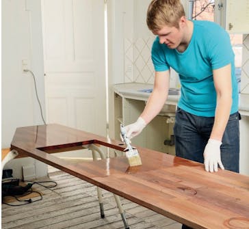Pöytälevy hiotaan huolellisesti käyttäen 180 karkeuden hiomapaperia. Jos pintaan jää tässä vaiheessa joitakin kohoumia, ne on helppo silottaa. Työ sujuu helposti, sillä tässä vaiheessa säännöllisiin pintoihin on helppo päästä käsiksi.