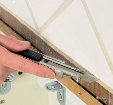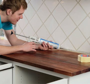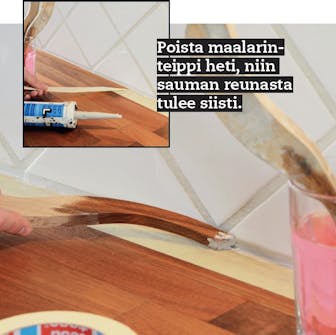 Pöytälevyn ja laattojen välinen sauma avataan terävällä veitsellä. Älä käytä silikoninirrotusainetta, sillä jos ainetta jää työn päätteeksi vähänkin jäljelle, se irrottaa myös uuden sauman.