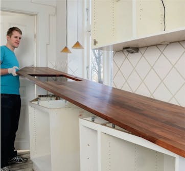 Vanhat pöytälevyt saavat olla paikallaan mahdollisimman pitkään, jotta keittiötä voitaisiin käyttää ja vanhoista levyistä saataisiin mitat uusia varten.