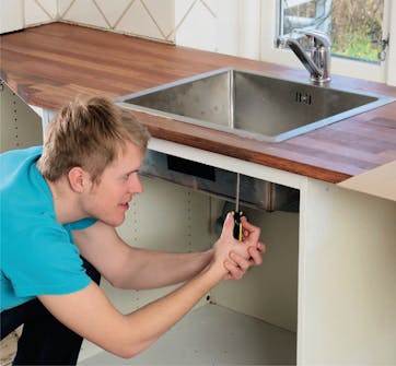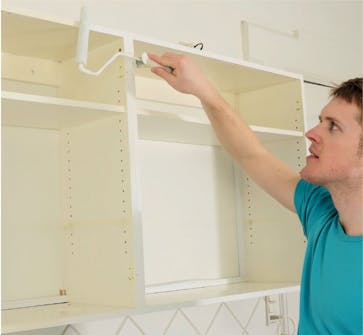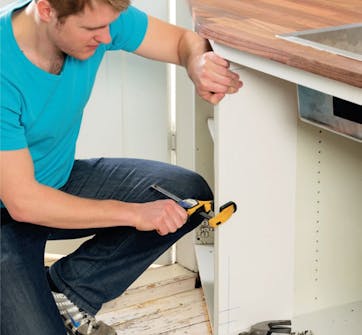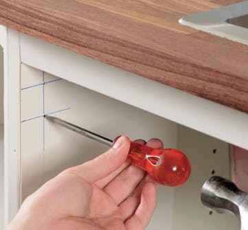 Etulista ruuvataan kiinni kaappien alle 4 x 50 mm ruuveilla. Ruuveille esiporataan reiät ja ruuvien kannat upotetaan, jotta ne saadaan siististi peittoon. Varo, ettet ruuvaa liian syvälle ja tee reikää sisäpuolelle.