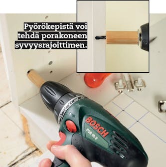 Ruuvien reiät porataan. Reikiä ei porata aivan kokonaan kaapin sivujen läpi, joten on tärkeää, ettet poraa liian syvälle. Käytä porassa syvyysrajoitinta tai valmista itse syvyysrajoitin sopivan pituisesta pyörökepin pätkästä.