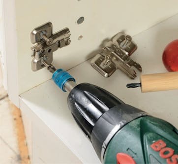 Kaappiin kiinnitettävä saranosa ruuvataan kiinni kaapin sisäpintaan kahdella ruuvilla. Niiden on sijoituttava tarkasti, joten valmistamme porausohjaimen. Kun se on käytössä, oven saa paikoilleen muutamassa minuutissa.