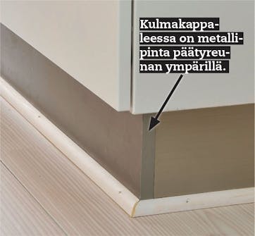 Sokkeliin haluttiin teräksinen ilme, sillä se sopii hyvin valkoisiin kodinkoneisiin. Uusi teräslevy liimataan vanhan sokkelin pintaan naulojen ja ruuvien sijaan. Se on helpompaa, eikä sokkeliin tule reikiä.
