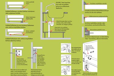 Kalusteet asennetaan sokkelille niin, että putkille on helppo pääsy. Jos takaseinä on hyvin vino, kaappien takalevystä voi usein sahata hieman pois. Viemärin ja vesiputkien läpivientipaikka tarkistetaan.