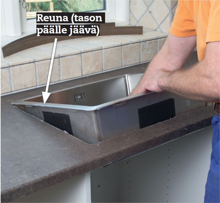 Ennen kuin asennat pöytälevyn tai -levyt, sovita kaappia altaaseen. Kaapin päällä tulee olla sopivan kokoinen aukko altaalle, ja sen sijaan että sahaat pöytäle-vyn ja kaapin yläosan läpi yhdellä ker-taa, sahaa hieman pois kaapin yläosan jäykisteestä. Riittää, että etureunaan jää 5-8 cm leveä lista, johon pöytälevyn voi ruuvata kiinni. Pöytälevy on paras sahata ohjainkiskollisella pyörösahalla.