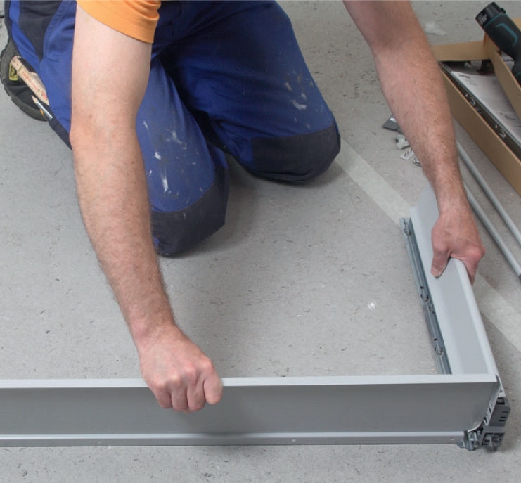Kiinnitä ensin kaikki laatikoiden liukukiskot. Kaapit varustetaan laatikoilla ennen kuin ne kootaan, joten kaappien sivulevyihin kannattaa kiinnittää liukukiskot jo valmiiksi. Näin et joudu ryömimään kaapeissa, kun ne on asennettu.