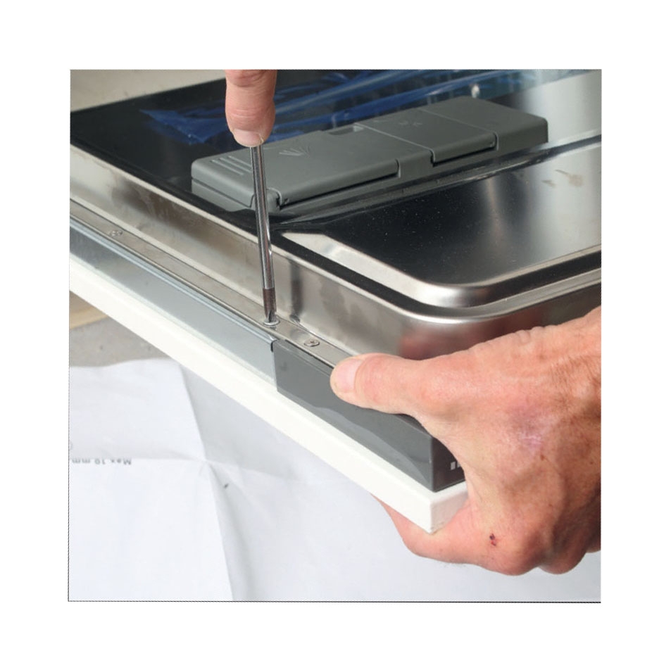 Asenna lopuksi etulevyt. Ne kiinnitetään säädettävillä heloilla eikä niitä kiinnitetä lopullisesti ennen kuin kaikki kaapit ja laatikot ovat paikoillaan.