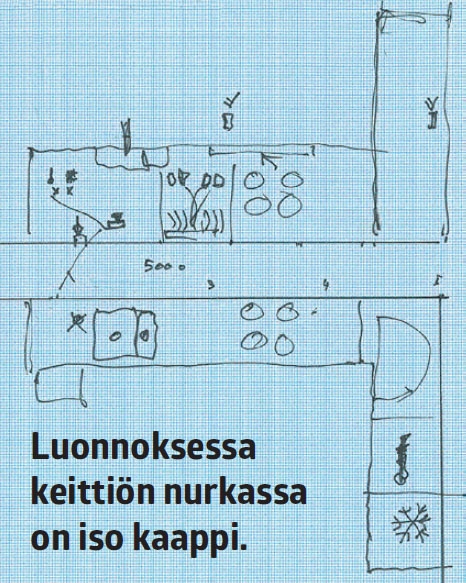 Nurkkaan jää kaksi kaappia, joihin upotetaan uuni ja jää-pakastinkaappi.