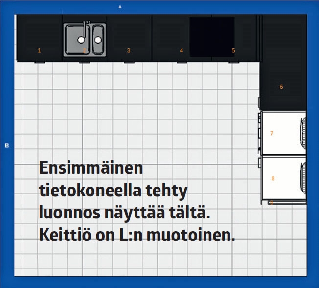 Seuraavaksi uusi keittiö piirretään Ikean kotisivuilla olevalla suunnitteluohjelmalla. Aluksi ohjelmaan luodaan käyttäjätunnukset ja aloitetaan uusi projekti. Keskeneräisen luonnok-sen voi tallentaa Ikean palvelimelle milloin tahansa, ja piirtämistä voi jatkaa myöhemmin miltä tahansa verkkoon yhdistetyltä tietokoneelta.