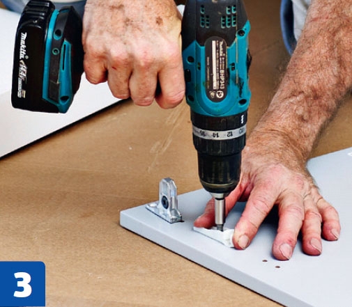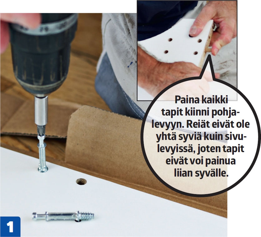 Ruuvaa kolme kasausruuvia jokaiseen sivulevyyn. Alakaapin päälle ei asenneta kalustelevyä, joten ruuveja tarvitaan vain kaapin alaosaan. Paina tapit kiinni pohja-levyn reunaan.