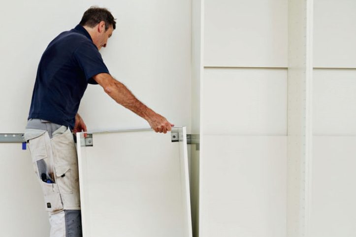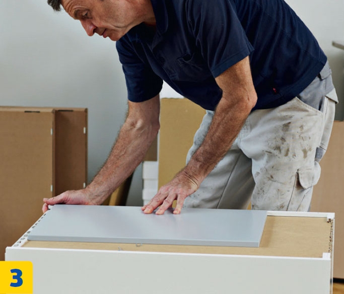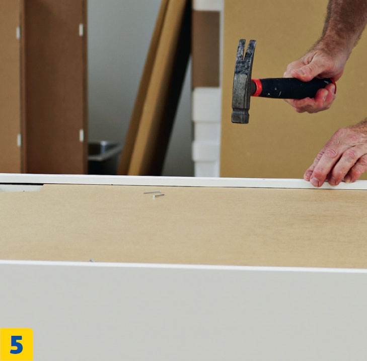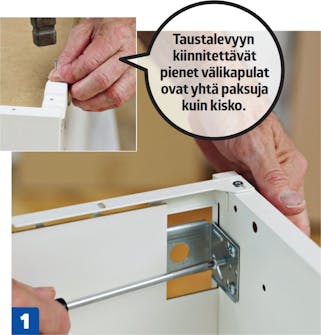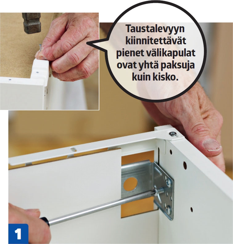 Liu’uta taustalevy paikalleen. Ripustus-heloille tarkoitettujen kolojen pitää olla levyn yläosassa. Varo, ettet sorru yleiseen virheeseen: levyn valkoinen puoli kuuluu kaapin sisäpuolelle.