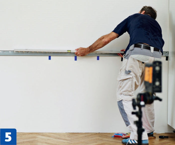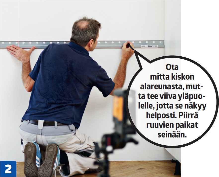 Piirrä ripustuskiskon linja seinään. 80-senttisten kaappien kiskon alareuna pitää kiinnittää vähintään 82 senttiä lattian ylä puolelle. Sokkelista tulee silloin 8 senttiä korkea, ja pöydän pinta nousee 90 senttiin.